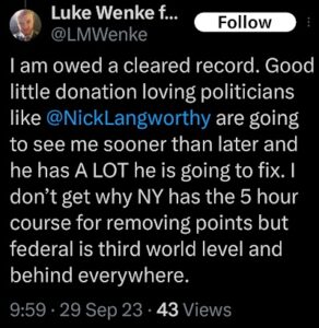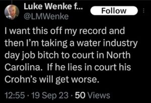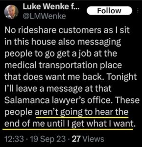 Categories: Luke Wenke, False Allegations: wrongful conviction/incarceration; Obsessions: Carl Paladino obsession, Katie Obsession, Ryan/Benjamin obsession; screenshots, social media posts, Threats: escalation, false reviews, reputation damage, threats to sue