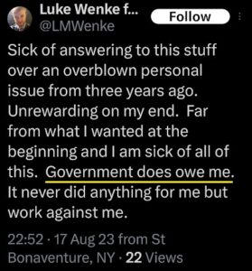 luke wenke twitter screenshot owed demands 2023 x entitled