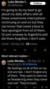 luke wenke x twitter screenshot demands self-pity owed