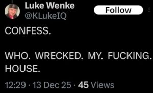 NOTE: In the weeks leading up to his most recent arrest on 12/17/2025, Luke Wenke used “Hamas” as a code word for several of his victims including myself, Ryan (his romantic obsession), and the Minnesota attorney he served prison time for cyberstalking.