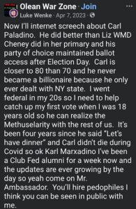 “Wow fuck you Mayor Aiello, your longtime friend my cousin [name] told me you and the rest of your Olean city government retirement fund payroll members had been plotting to do this to me for years after that Chuck E Cheese meme I made Olean Times Herald over.” (p. 2)