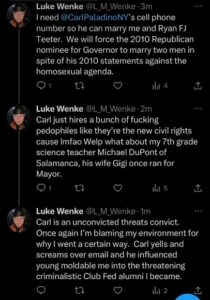 X/Twitter, 08:51 AM: NOTE: In the weeks leading up to his most recent arrest on 12/17/2025, Luke Wenke used “Hamas” as a code word for several of his victims including myself, Ryan (his romantic obsession), and the Minnesota attorney he served prison time for cyberstalking. Please also note that the use of this terminology does not reflect my political views or affiliations. “Cheyenne Redeye is a Seneca native of Salamanca and I can Pro Se sue SNI courts because they aren’t interpreting family court law to her liking. And then what she will do is provide paperwork proof of the fact that she was once a neighbor of mine on [address] and she has seen Katie [last name] going in and out of my house breaking things.” (p. 1) 11/06/2025: