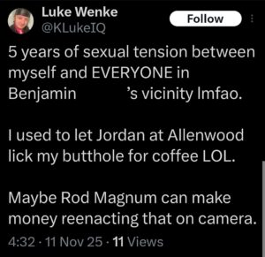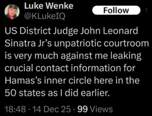 NOTE: In the weeks leading up to his most recent arrest on 12/17/2025, Luke Wenke used “Hamas” as a code word for several of his victims including myself, Ryan (his romantic obsession), and the Minnesota attorney he served prison time for cyberstalking.