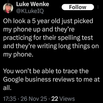 screenshot of luke wenke complaining about feeling humiliated november 2025