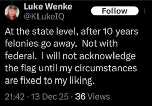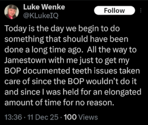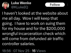 screenshot of a december 2025 luke wenke x/twitter post saying he's owed for wrongful incarceration