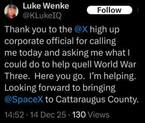 screenshot of an x/twitter post by luke wenke obsessing over salamanca ny planning board member Michael Crick december 2025