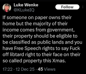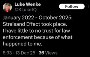 screenshot of an x/twitter post by luke wenke pretending to be a victim december 2025