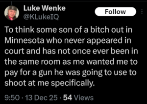 screenshot of a december 2025 luke wenke x/twitter post blaming public defenders for his problems