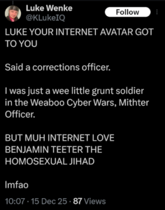 luke wenke crying like a bitch to some religious weirdo x/twitter november 2025