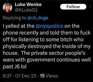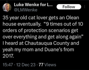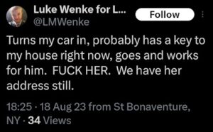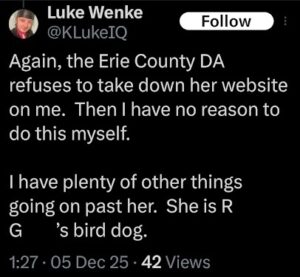 Categories: Luke Wenke, False Allegations: burglary/home invasion, conspiracy/collusion, drug crimes, drug use, hacking, HIPAA violations, trespassing, vandalism/property damage; Obsessions: Carl Paladino obsession, Katie Obsession, Ryan/Benjamin obsession; screenshots, social media posts, Threats: death threats, doxxing, lying to police, misuse of personal information, physical harm, threats to sue