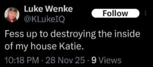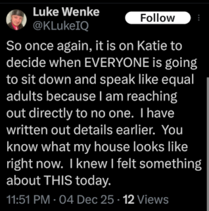 The next post is particularly disturbing because it’s about my ex-husband, whom I’ve been divorced from since 2012 (yes, 14 years ago). There’s no bad blood between us, as far as I know, because we haven’t spoken in well over a decade. The fact that Luke Wenke thinks about my past partners more often than I do reflects the troubling extent of his irrational obsession with me.