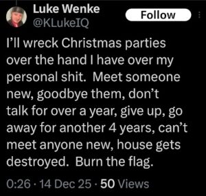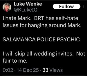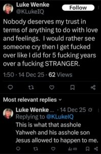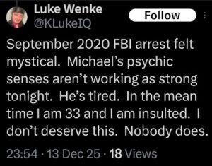 NOTE: In the weeks leading up to his most recent arrest on 12/17/2025, Luke Wenke used “Hamas” as a code word for several of his victims including myself, Ryan (his romantic obsession), and the Minnesota attorney he served prison time for cyberstalking. I believe that Wenke’s use of the term “Israeli Army” is a reference to a theoretical paid assassin (i.e. a hitman).